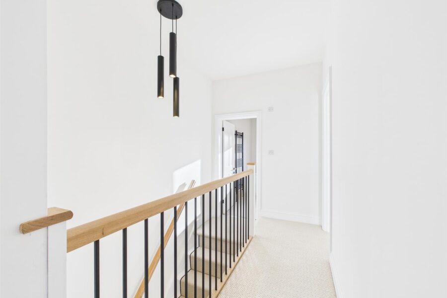 The first floor offers a spacious galleried landing with storage, three well-proportioned double bedrooms, two with fitted wardrobes, and a luxury refitted four-piece bathroom suite.