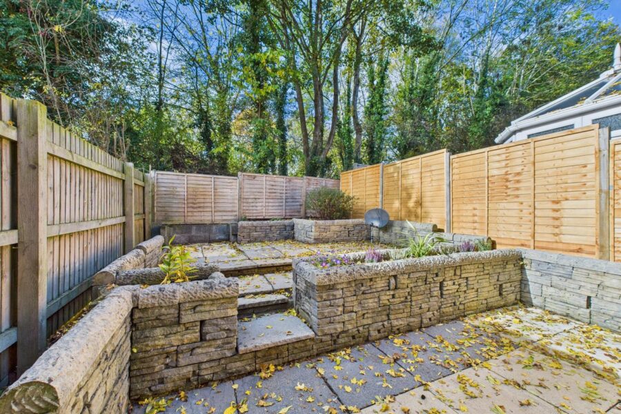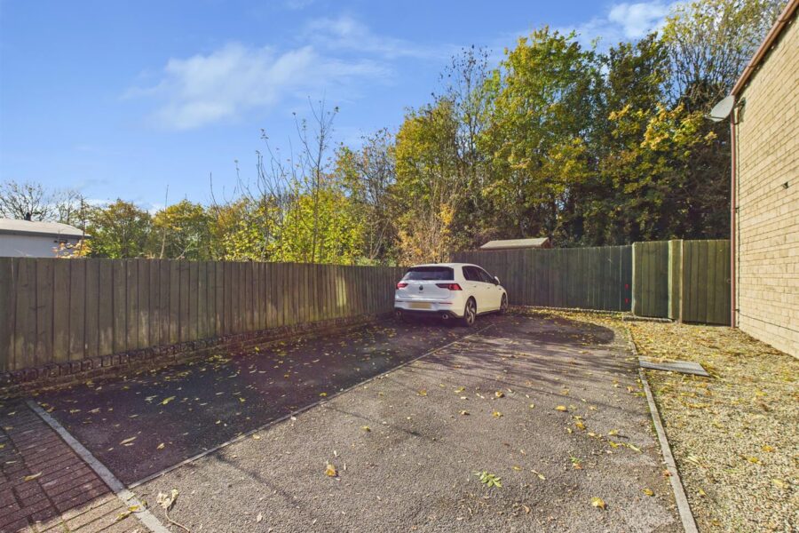 Externally, the property features a small courtyard garden to the front, an enclosed rear garden, and off-road driveway parking for two vehicles located nearby.